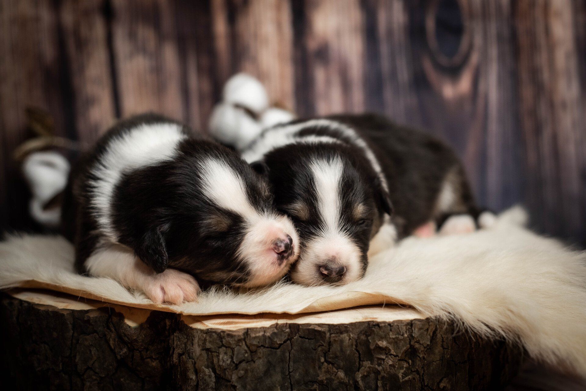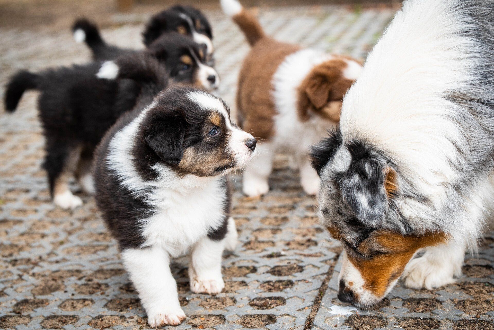 Sie toben schon ein bisschen und kauen an Spielzeugen herum. Wenn es nicht so viel zu tun gäbe, würde ich einfach nur zwischen den Welpen liegen.